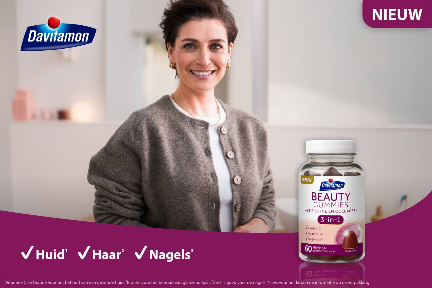 Binnen deze nieuwe lijn vormen de Beauty Gummies het hero‑product. Gummies zijn voor veel consumenten een vertrouwde en toegankelijke manier om ‘beauty van binnenuit’ te ondersteunen. Davitamon bouwt hierop voort met een vernieuwende formule waarin collageen en biotine worden gecombineerd met multivitamines in één gummy. De suikervrije Beauty Gummies bieden een herkenbare, maar inhoudelijk vernieuwende manier om huid, haar en nagels dagelijks te ondersteunen (1).