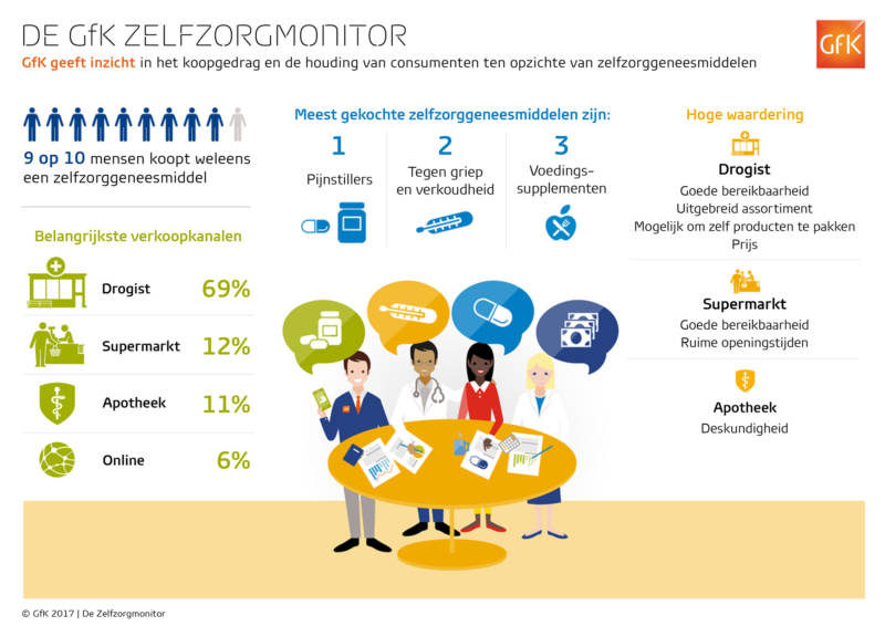 Uit de GfK Zelfzorgmonitor 2017 blijkt dat 9 op de 10 mensen wel eens een zelfzorggeneesmiddel koopt. De meest gekochte producten zijn pijnstillers, gevolgd door middelen tegen griep en verkoudheid en voedingssupplementen. 6% van de consumenten koopt deze online. De zelfzorggeneesmiddelen worden het meest vaak bij de drogist gekocht (69%) gevolgd door de supermarkt (12%) en apotheek (11%). Sinds 2009 maakt GfK elke 2 jaar een Zelfzorgmonitor die inzicht geeft in het koopgedrag en de houding van consumenten ten opzichte van zelfzorggeneesmiddelen.