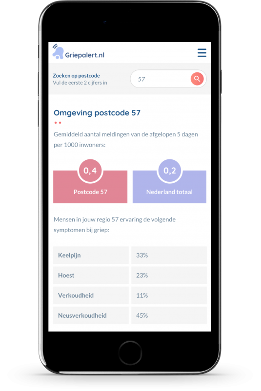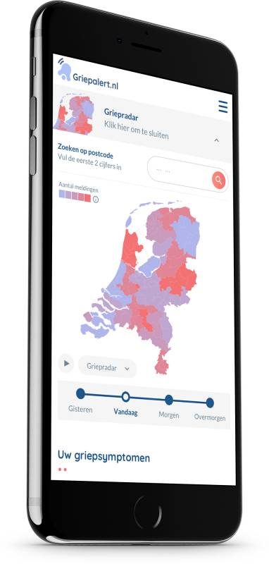 Op Griepalert.nl volg je de griep in Nederland. Het platform visualiseert het aantal griepmeldingen in Nederland per tweecijferige postcode. Dankzij het geavanceerde voorspellingsmodel is het mogelijk de griep zelfs twee dagen vooruit te voorspellen. Griepalert.nl vraagt haar bezoekers eventuele griep(symptomen) te melden. De gemelde symptomen worden verwerkt in een rekenmodel en per postcodegebied gevisualiseerd op een griepkaart. Op deze manier is te zien uit welke symptomen de griep bestaat, op postcodeniveau.