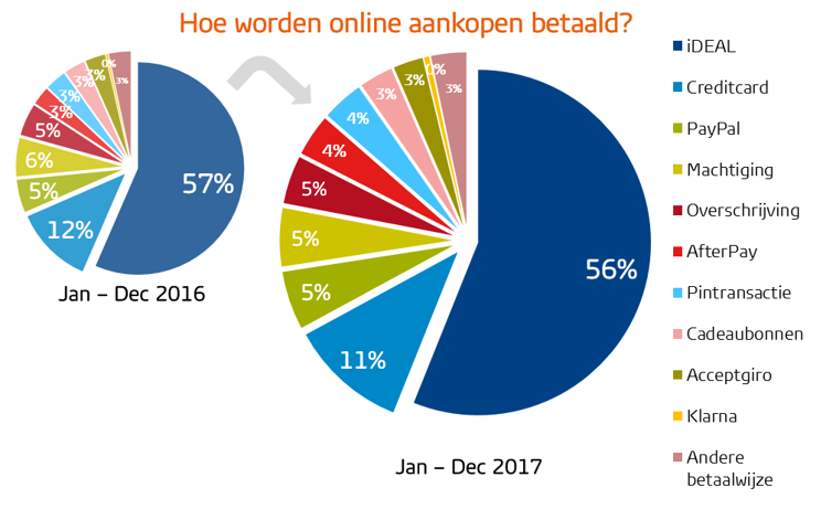 Op basis van het aantal aankopen groeit de totale online markt in 2017 met 17% ten opzichte van 2016. Waar in 2016 nog 173 miljoen online aankopen werden gedaan, is dit in 2017 toegenomen tot 202 miljoen. iDEAL blijft met 56% van alle online aankopen de meest gekozen betaalwijze, gevolgd door de creditcard (11%).
