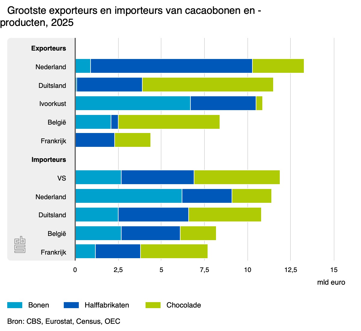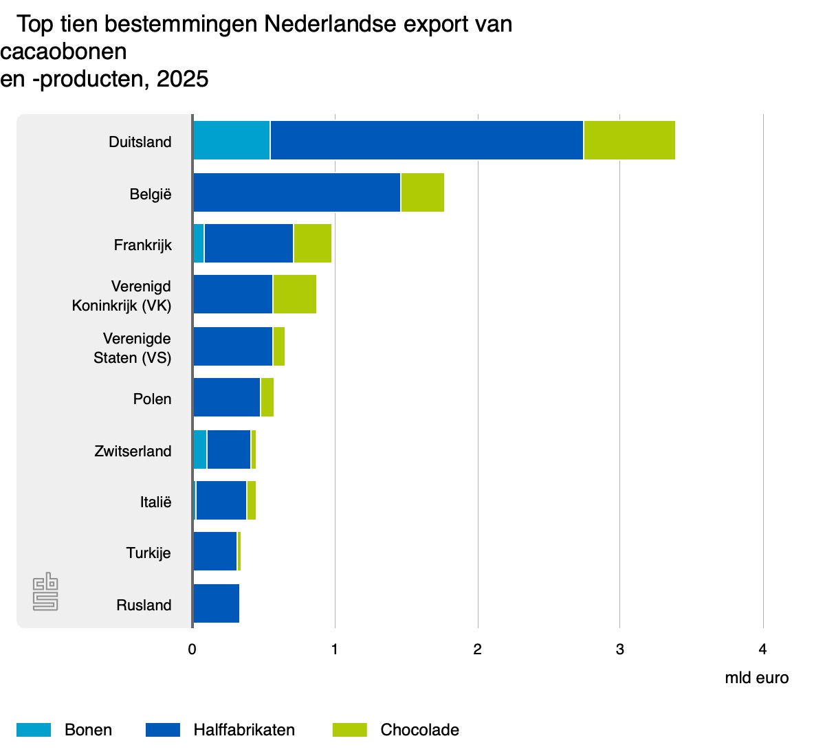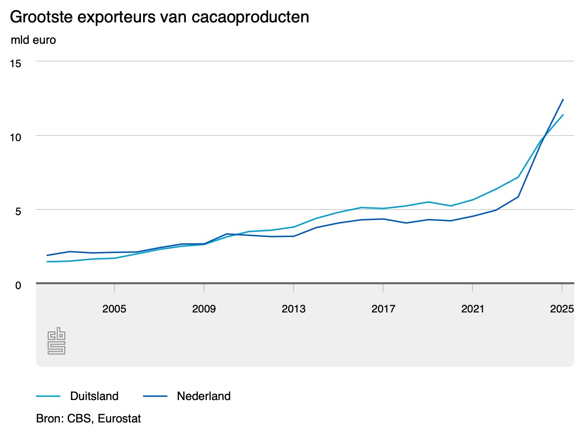 In 2025 exporteerde Nederland voor €12,4 miljard aan cacaoproducten, waarmee het Duitsland (€11,4 miljard) voorbijstreefde. Duitsland was sinds 2010 onafgebroken de grootste exporteur, maar die positie is nu weer in handen van Nederland. Waar Duitsland zich vooral richt op chocolade – goed voor ongeveer twee derde van de export – bestaat de Nederlandse uitvoer voor circa driekwart uit halffabricaten en slechts voor een kwart uit chocolade.