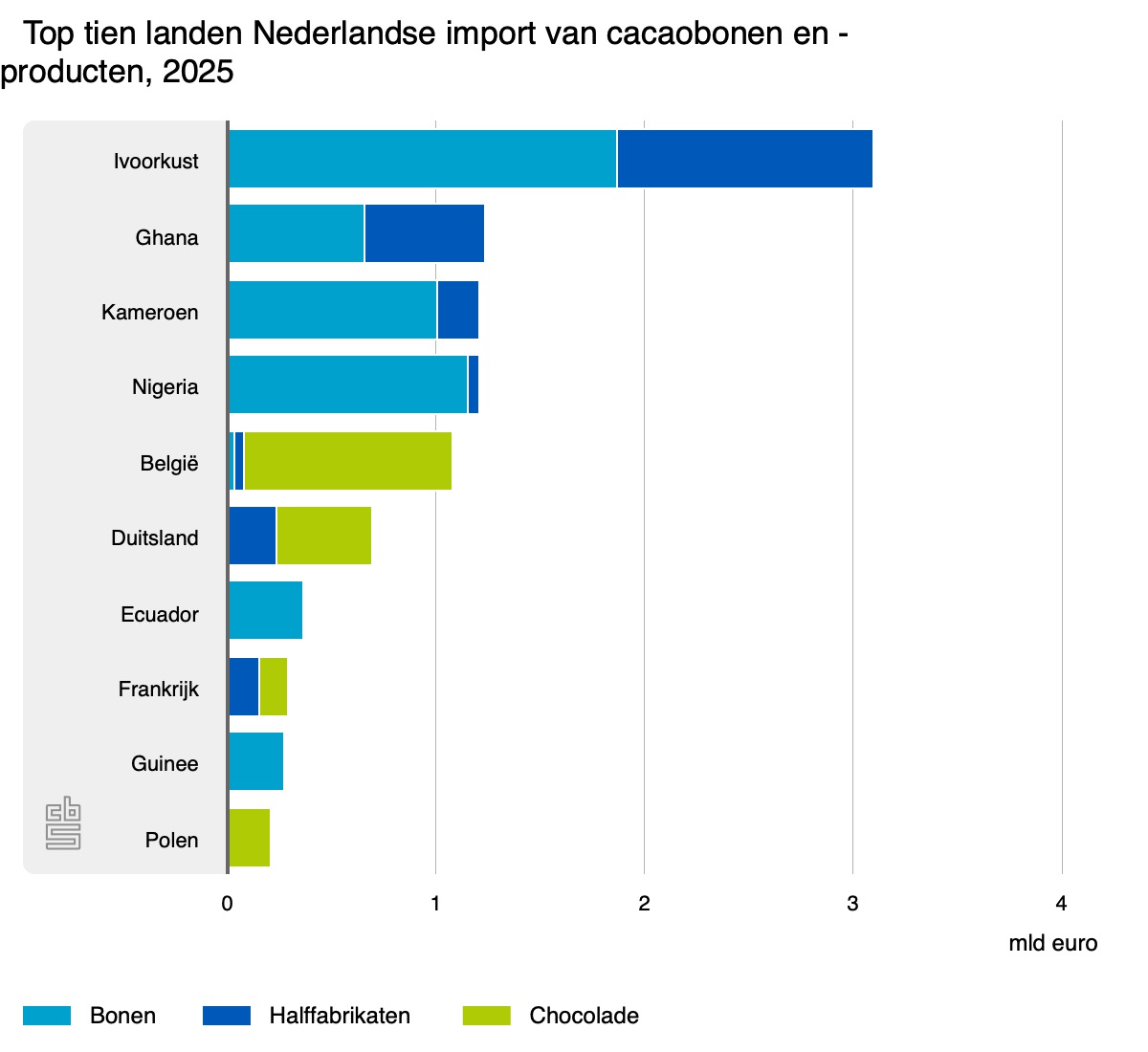 Ivoorkust is met 27 procent de grootste leverancier van cacaobonen en cacaoproducten aan Nederland. Daarnaast komen veel cacaobonen uit andere West-Afrikaanse landen, zoals Ghana, Kameroen en Nigeria. Uit België en Duitsland importeert Nederland vooral chocolade.