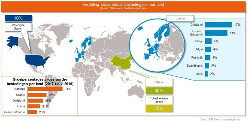 Buurland Duitsland is na China het populairst voor Nederlandse online shoppers. 17% van de Nederlandse cross-borderbestedingen gaat via Duitse webwinkels. Groot-Brittannië staat op een derde plaats met een aandeel van 14%. Opvallende stijgers dit jaar zijn Frankrijk en Spanje. Spanje heeft (nog) een relatief laag aandeel van 4% binnen de cross-borderbestedingen, maar ziet wel bijna een verdubbeling van de Nederlandse cross-borderbestedingen terug. Ook Frankrijk wint aan populariteit (+84%).