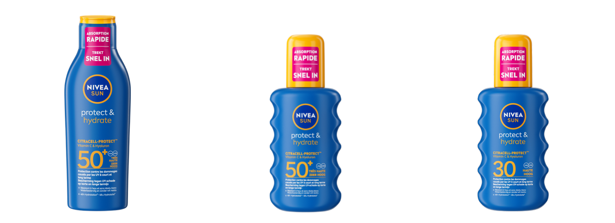 NIVEA trapt het zonseizoen af met de revolutionaire herlancering van de Protect & Hydrate-lijn. Dankzij de verbeterde formule met Citracell Protect – een krachtige mix van hyaluronzuur, vitamine E en C – biedt deze zonnebescherming niet alleen effectieve UVA/UVB-filtering, maar ook tot 48 uur intense hydratatie. De ultra lichte textuur trekt binnen enkele seconden in, laat geen plakkerig gevoel achter en smeert moeiteloos uit, terwijl het een extra beschermingslaag tegen de zon vormt. De vernieuwde Protect & Hydrate-lijn is verkrijgbaar in diverse SPF’s en formaten (30, 50, 100, 150, 200 en 400 ml) in zowel spray- als lotionvorm.