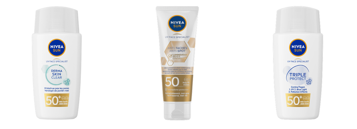 Voor de onzuivere huid is er de NIVEA UV Face DERMA Skin Clear SPF50+. Met een lichte formule, Anti-Onzuiverheden Complex en Niacinamide voorkomt het verstopte poriën, houdt je huid gematteerd en biedt het betrouwbare zonbescherming. Heb je last van pigmentvlekken? De NIVEA SUN UV Face Anti-Spot Luminous630 SPF50+ helpt door de zon veroorzaakte vlekken te voorkomen en verminderen. Zoek je dagelijkse allround bescherming? De NIVEA SUN UV Face Specialist Triple Protect Fluid SPF50+ 40ml beschermt niet alleen tegen UV-stralen, maar ook tegen blauw licht en de effecten van vervuiling.
