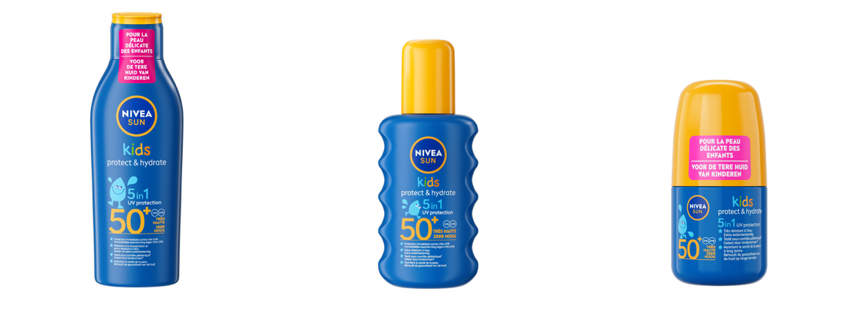 De producten zijn te verkrijgen in SPF 50+ in een praktische roller, spray- en lotion vorm (50, 150, en 200ml). De NIVEA SUN Kids Protect & Hydrate lijn biedt UVA/UVB-bescherming, hydrateert de (gevoelige) huid, beschermt tegen uitdroging en is waterbestendig. De NIVEA SUN Kids formules zijn vrij van schadelijke UV-filters* en de flessen zijn gemaakt van minstens 96% gerecycled plastic (label en dop uitgezonderd).