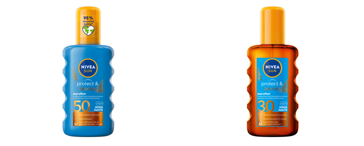Je wil goed beschermd zijn tegen de zon, maar ook een mooie, zonnige teint krijgen. NIVEA SUN Protect & Bronze biedt het beste van beide werelden. Deze lijn van olie, sprays en lotions beschermt je huid tegen de zon met effectieve UVA/UVB-bescherming en helpt tegelijkertijd je huid sneller en natuurlijk bruin te worden. Dit komt door de toevoeging van pro-melanine extract, dat het huideigen bruiningsproces stimuleert.
