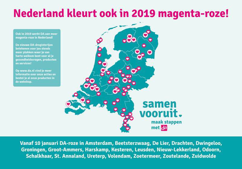 Vorig voorjaar presenteerde NDS haar plannen voor de vernieuwde DA-formule. Het realiseren van deze plannen werd vanaf dat moment in werking gezet. Zo introduceerde NDS in 2018 niet alleen de DA-webshop, maar ook de eerste, exclusieve, onderscheidende merken en huismerkproducten en stond het thema ‘Sterke botten’ centraal. In 2019 staan onder andere de introductie van een nieuw magazine en klantenbinder app op de planning. Hiermee geeft NDS meer en meer invulling aan de gekozen formulerichting. Voor alle ondernemers en de NDS-organisatie is het een positieve ontwikkeling dat DA op steeds meer plekken aanwezig is. Door de hoge naamsbekendheid en vele plekken waar je DA vindt (zowel off- als online) wordt het voor de consument makkelijker en aantrekkelijker naar DA te gaan.