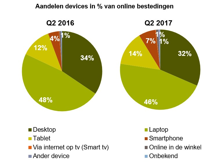 De desktop verliest wederom aan populariteit, maar ook de laptop verliest in Q2 2017 aandeel. Waar in Q2 2016 nog 82% van alle online bestedingen via een desktop of laptop werd gedaan, is dit percentage voor de meer traditionele apparaten in Q2 2017 gedaald tot 77%. Het verloren aandeel gaat naar de zogeheten ‘mobiele devices’: de tablet en de smartphone. In Q2 2017 wordt 21% van alle bestedingen via deze apparaten gedaan (tegenover 17% in Q2 2016). De smartphone ziet haar aandeel ten opzichte van een jaar geleden relatief het hardste groeien; van 4% naar 7% (+56%). Het aandeel van de tablet stijgt van 12% naar 14%, wat een groei van 13% betekent.