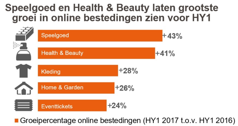 Van alle bestedingen aan producten en diensten (binnen de definitie van de Thuiswinkel Markt Monitor) wordt 23% online gedaan in het eerste half jaar van 2017 (HY1 2017), tegenover 21% in HY1 2016. Van de € 10,66 miljard aan online consumentenbestedingen is € 5,89 miljard uitgegeven aan de aankoop van producten, zoals elektronica, kleding en speelgoed. Deze bestedingen zijn met 16% gegroeid ten opzichte van dezelfde periode vorig jaar. De overige € 4,77 miljard is besteed aan de online aankoop van diensten, zoals pakketreizen, vliegtickets en verzekeringen. Dit is een stijging van 9% ten opzichte van het eerste half jaar van 2016. De productcategorieën Speelgoed en Health & Beauty laten voor HY1 2017 de grootste groei in online bestedingen zien (respectievelijk 43% en 41%).
