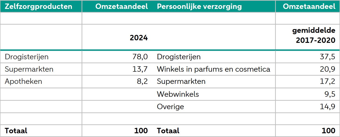 Daarnaast besteedden consumenten 3,7 miljard euro aan persoonlijke verzorging in 2024. Dit blijkt uit het jaarverslag 2024 vande Nederlandse Cosmetica Vereniging (NCV). Van de markt voor persoonlijke verzorging komt ruim een derde ten goede van drogisterijen, blijkt uit data over de jaren 2017-2020 van het Centraal Bureau van de Statistiek (CBS). Het gaat dan om producten zoals parfums, huidverzorging, decoratieve cosmetica, en haar- en mondverzorging.