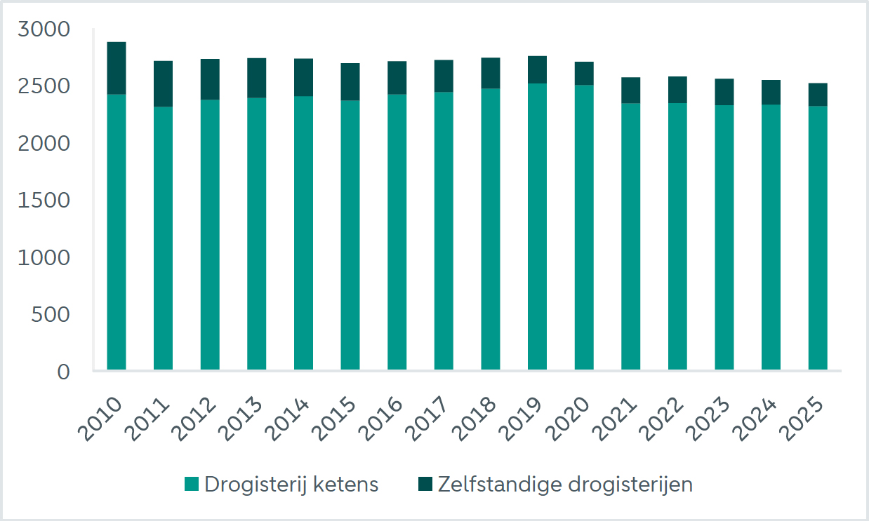 Figuur 2: Aantal vestigingen van ketendrogisterijen en zelfstandige drogisterijen
