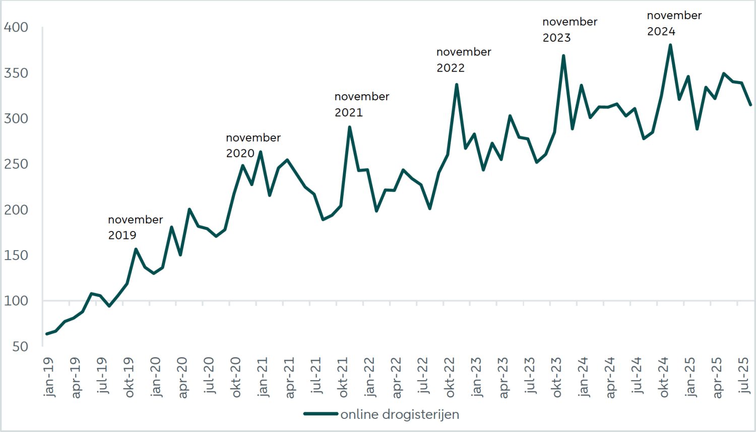 Zoomen we in op de bestedingen in fysieke winkels dan zien we een duidelijke groei na de coronacrisis (zie Figuur 4). Tijdenscorona was de groei van het drogisterijkanaal minimaal, omdat veel mensen drogisterijproducten bij de supermarkt kochten in plaats van bij de drogisterij, omdat zij liever maar één winkel bezochten. Na de coronaperiode zien we echter weer een gestage groei in de bestedingen. Wat verder opvalt zijn de pieken in december van elk jaar, veroorzaakt door de feestdagen zoals Sinterklaas en Kerst.