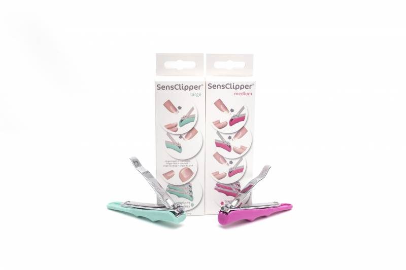 De SensClipper is op dit moment verkrijgbaar in een Medium (roze) en een Large variant (mint). Medium is ontworpen op een vingernagel en heeft een wat rondere beschermkom. Large is geoptimaliseerd om bredere vingernagels en ook teennagels mee te kunnen knippen, en is daarom bij uitstek geschikt voor mannen.