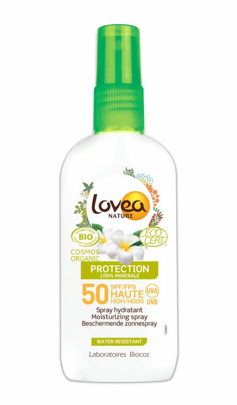 De nieuwe waterbestendige Sun Spray met SPF 50 van Lovea BIO Suncare  is de meeste veilige bescherming van de huid tegen zowel UVA- als UVB-straling. De formule is 100% natuurlijk, vrij van parfums en parabenen en bevat een mineraal titaniumdioxide zonnefilter. De samenstelling combineert een hoge SPF met effectieve verzorgende eigenschappendankzij de toegevoegde Ecocert kokosolie en vitamine E.